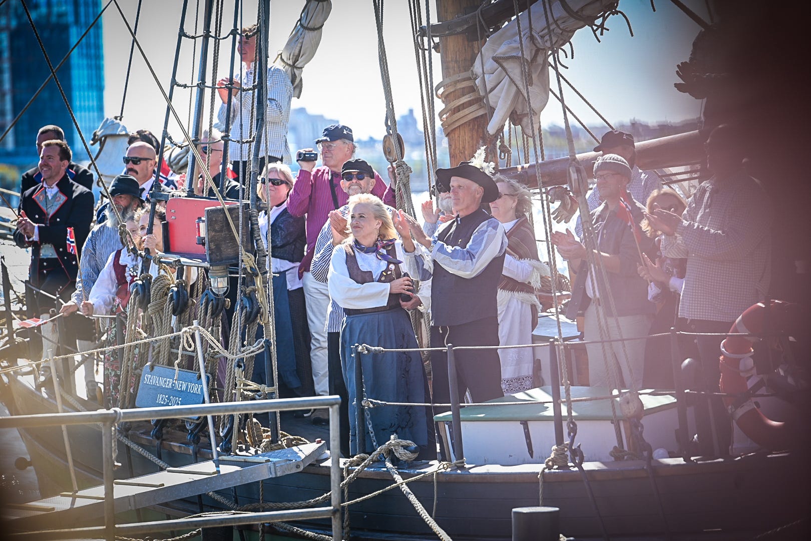 Among the crowd were many who carried the Restauration story in their own family trees. Kathy Osmond Anderson stood on the pier with her husband Larry and their daughter Monica, representing the Rosdail family, direct descendants of the original Sloopers who left Norway two centuries ago. Nearby, Barb Johnson, descended from the Slogevik line, waved her flag with quiet pride. They were far from alone — dozens of others tracing their lineage back to the 1825 voyage had made the pilgrimage to New York to see history come full circle.