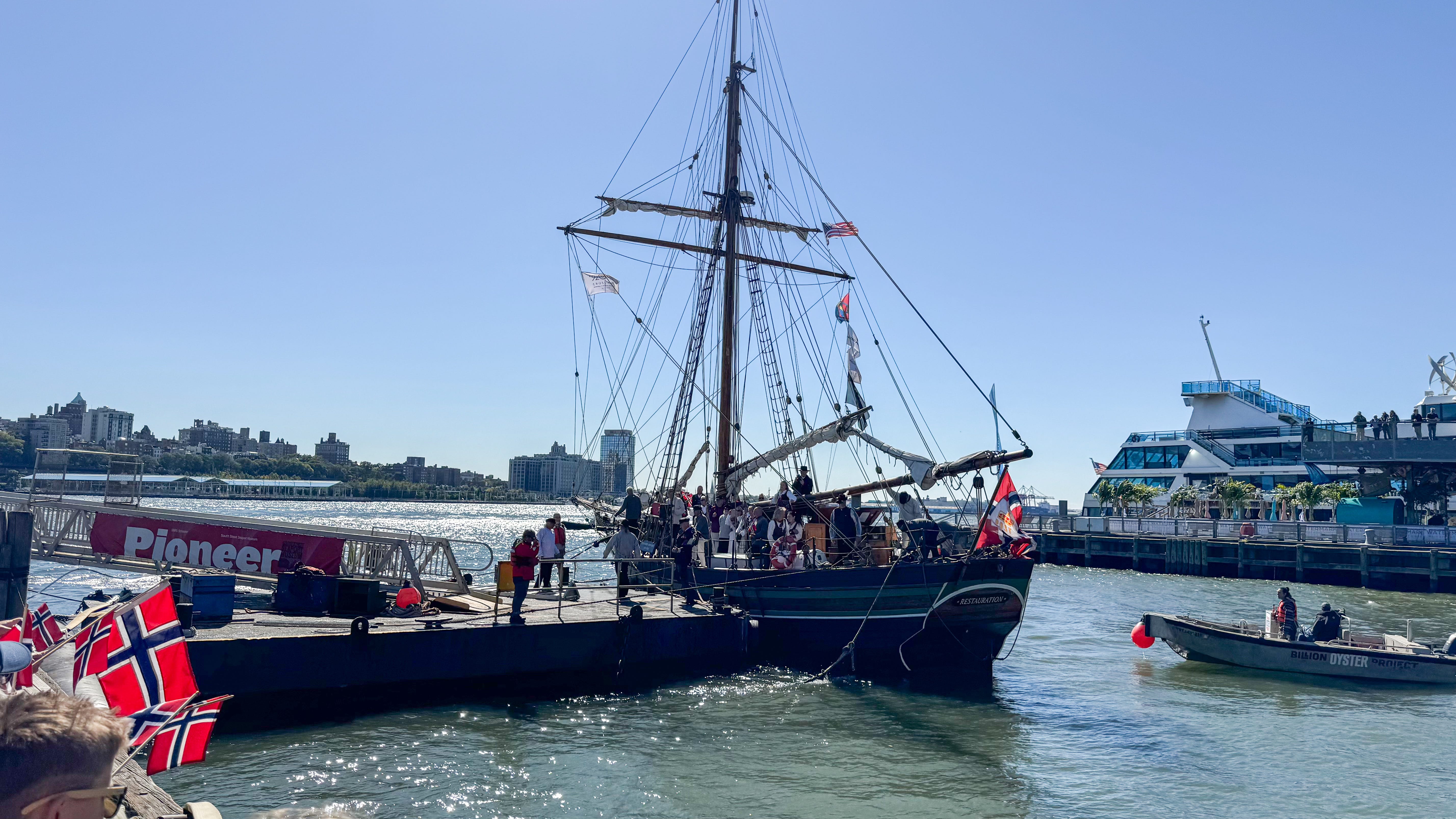 Pier 16 is no grand stage — just old timbers, museum ships, and the shimmer of the East River — but on this day it feels like a hinge between worlds. To the west rise the towers of Wall Street; to the east, the open Atlantic. The Restauration looks tiny against it all, yet her story fills the space completely. You don’t have to be big to leave a big mark, one observer says — echoing Aftenbladet’s line that the sloop “proved that again today.”